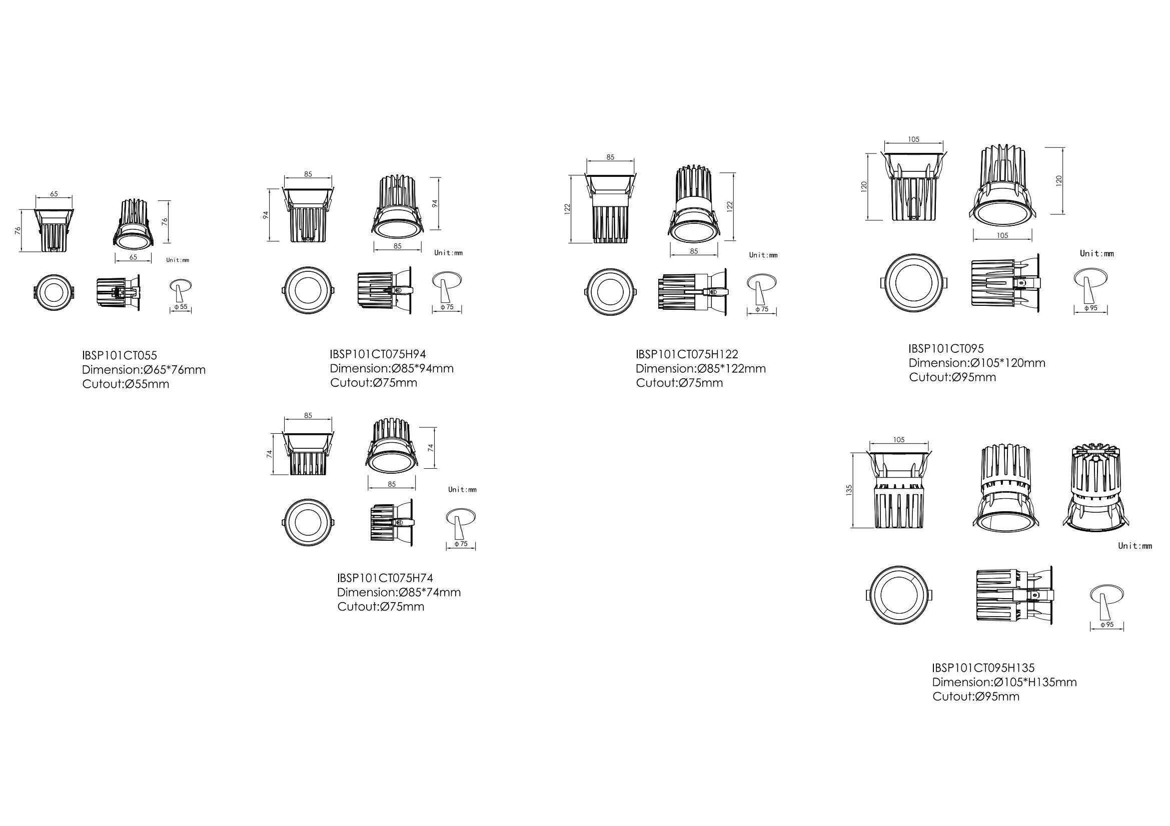 | IBSP101CT075 (H94) | 15W | Ø85mm×H94mm | Ø75mm | Reflector 15°| 24°|38°|45°|60° (Fixed) |