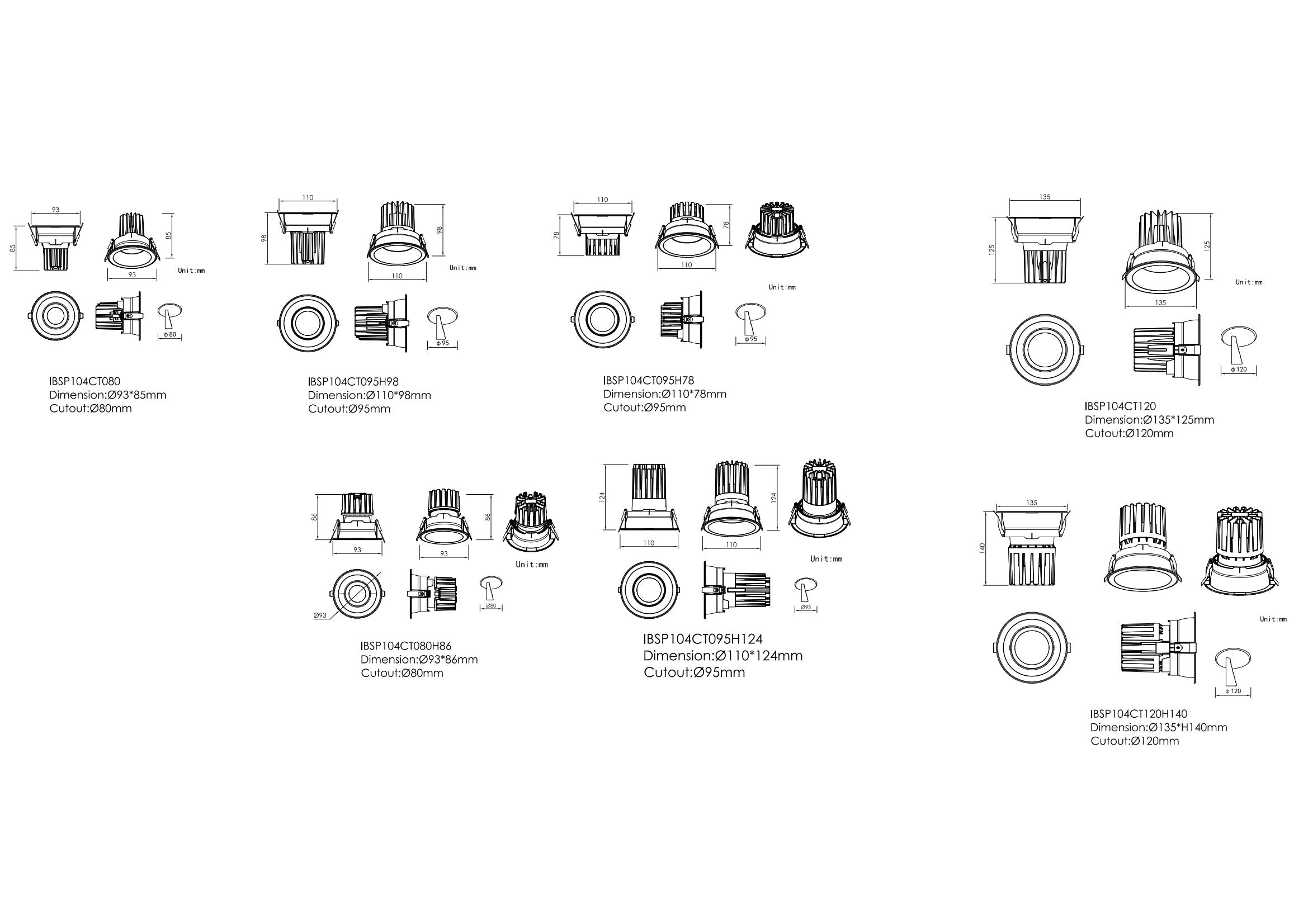 | IBSP104CT095 (H78) | 10W | Ø110mm×H78mm | Ø95mm | Reflector 15°| 24°|38°|45°|60° (Adjustable: horizontal 355°+vertical 30°) |