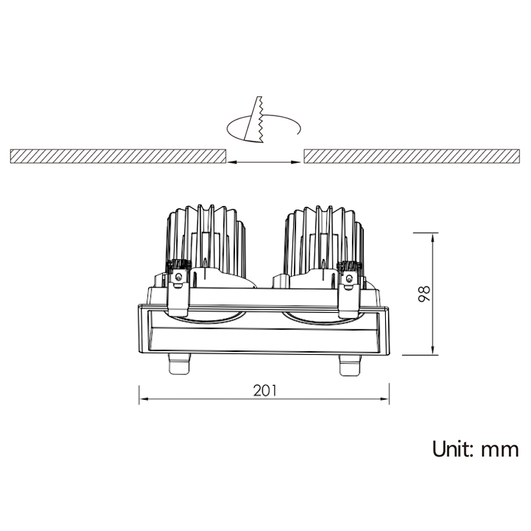 2*15W,Cutout L190×W95mm,Beam15°| 24°|38°|45°|60°,Horizontal 355° + Vertical 30°,IP65,Honeycomb louver Optional,Twin-head Adjustable LED Downlight
