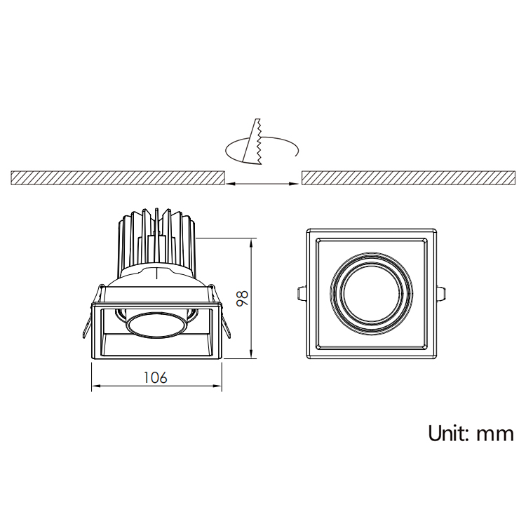 15W,Cutout L95×W95mm,Beam15°/20°/24°/36°/38°/40°/45°/60°,Horizontal 355° + Vertical 30°,IP65,Honeycomb louver Optional,Eyeball Square Adjustable LED Downlight