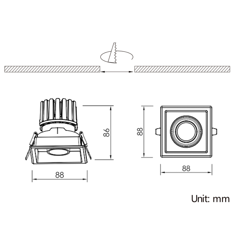 15W,Cutout L80×W80mm,Beam15°/20°/24°/36°/38°/40°/45°/60°,Horizontal 355° + Vertical 30°,IP65,Honeycomb louver Optional,Eyeball Square Adjustable LED Downlight