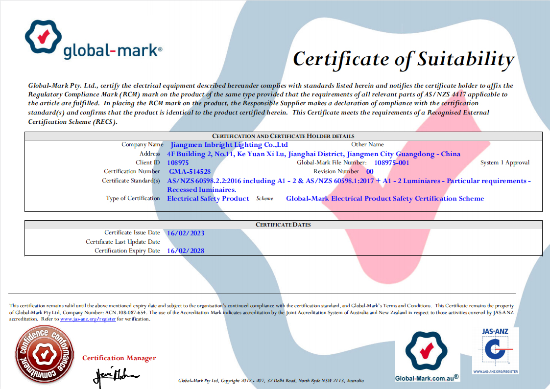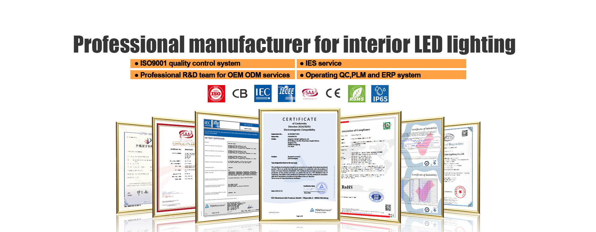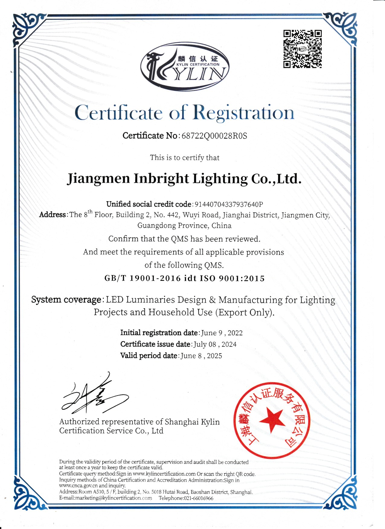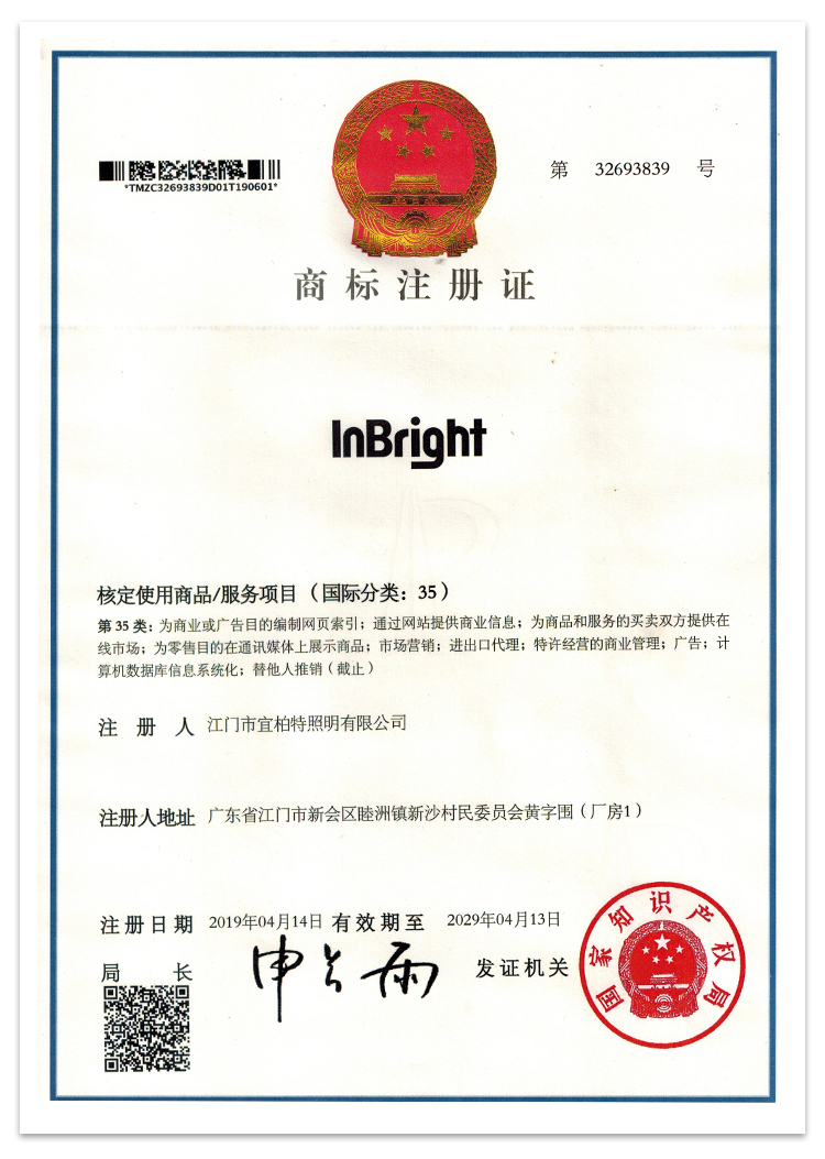 Inbright has passed the ISO 9001 Quality Management System Certification, and the products are certified by international certifications such as CB, SAAS, CE, ROHS, and SASO. The Company possesses complete testing equipment: IES light distribution curve tester (darkroom), integrating-sphere spectrum tester, constant temperature and constant humidity aging chamber, light transmittance tester, etc., and is also providing customers with professional ODM services. The product sales ratio of the Company: 90% for export and 10% for domestic sales. Inbright is committed to providing the most valuable lighting solutions for customers and becoming the most trusted provider of engineering lighting solutions.