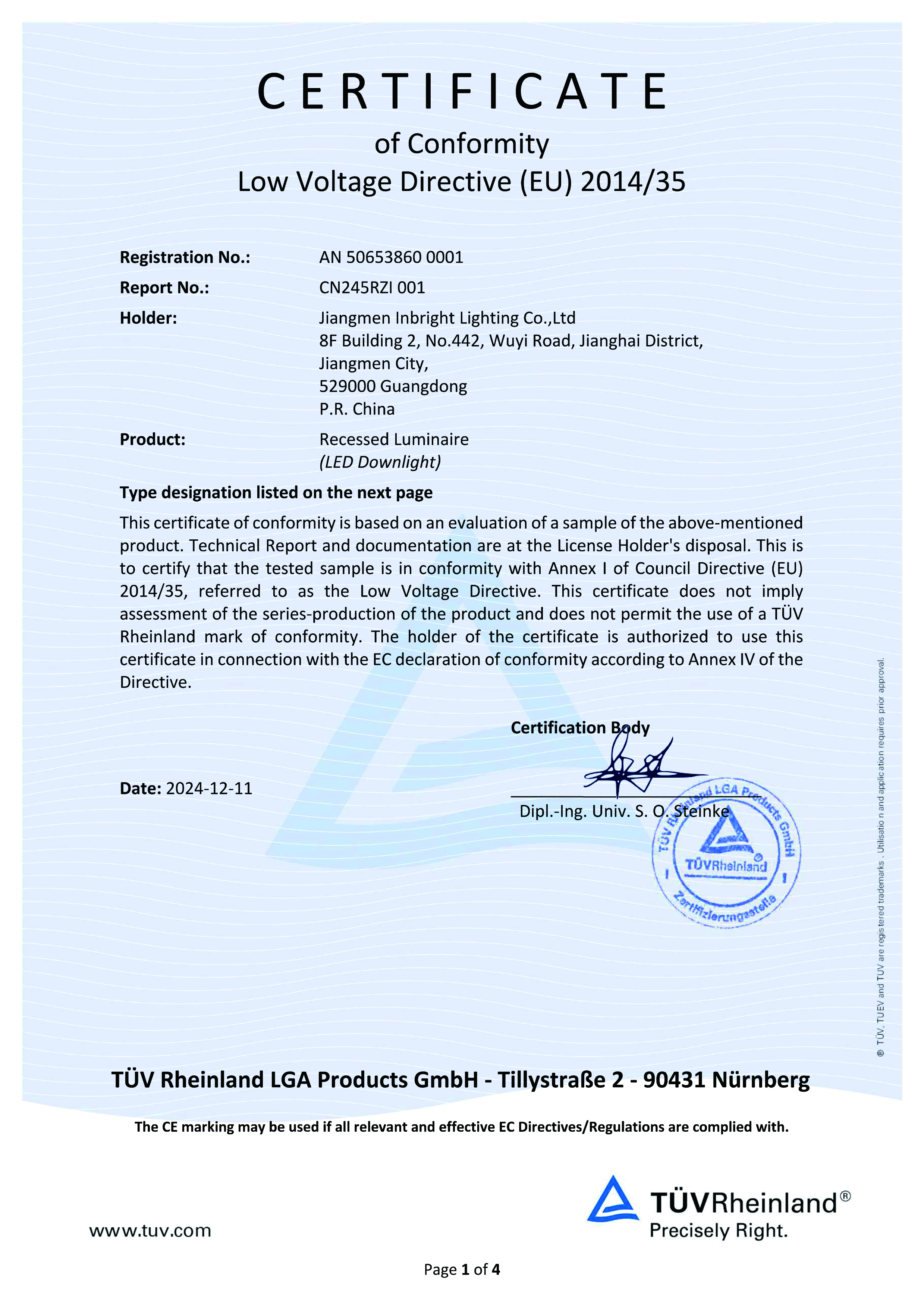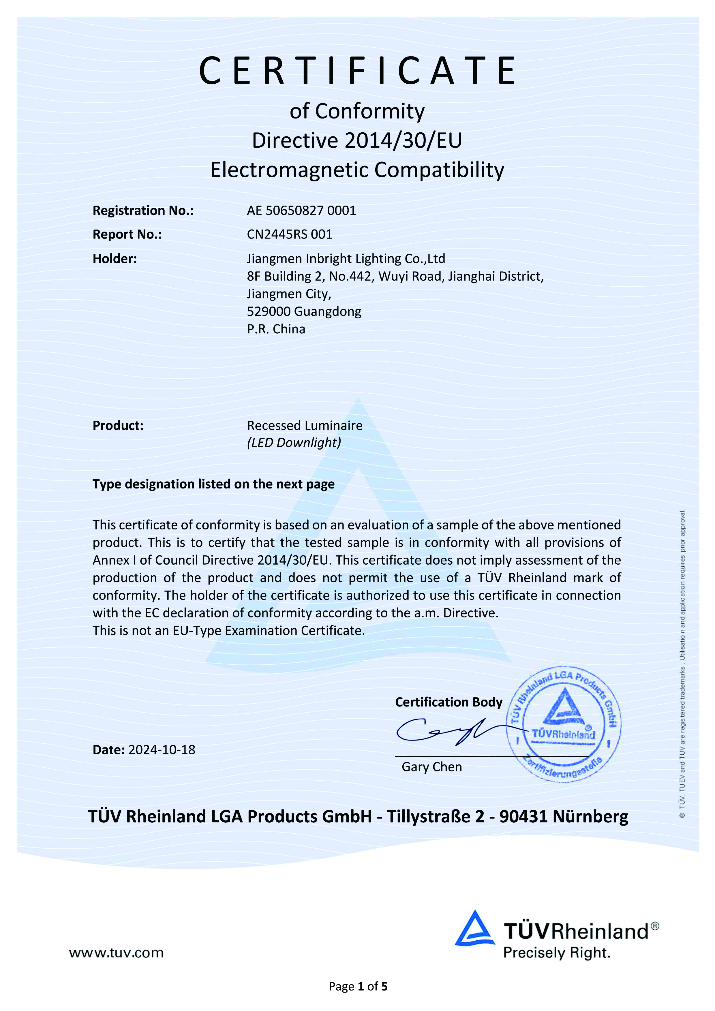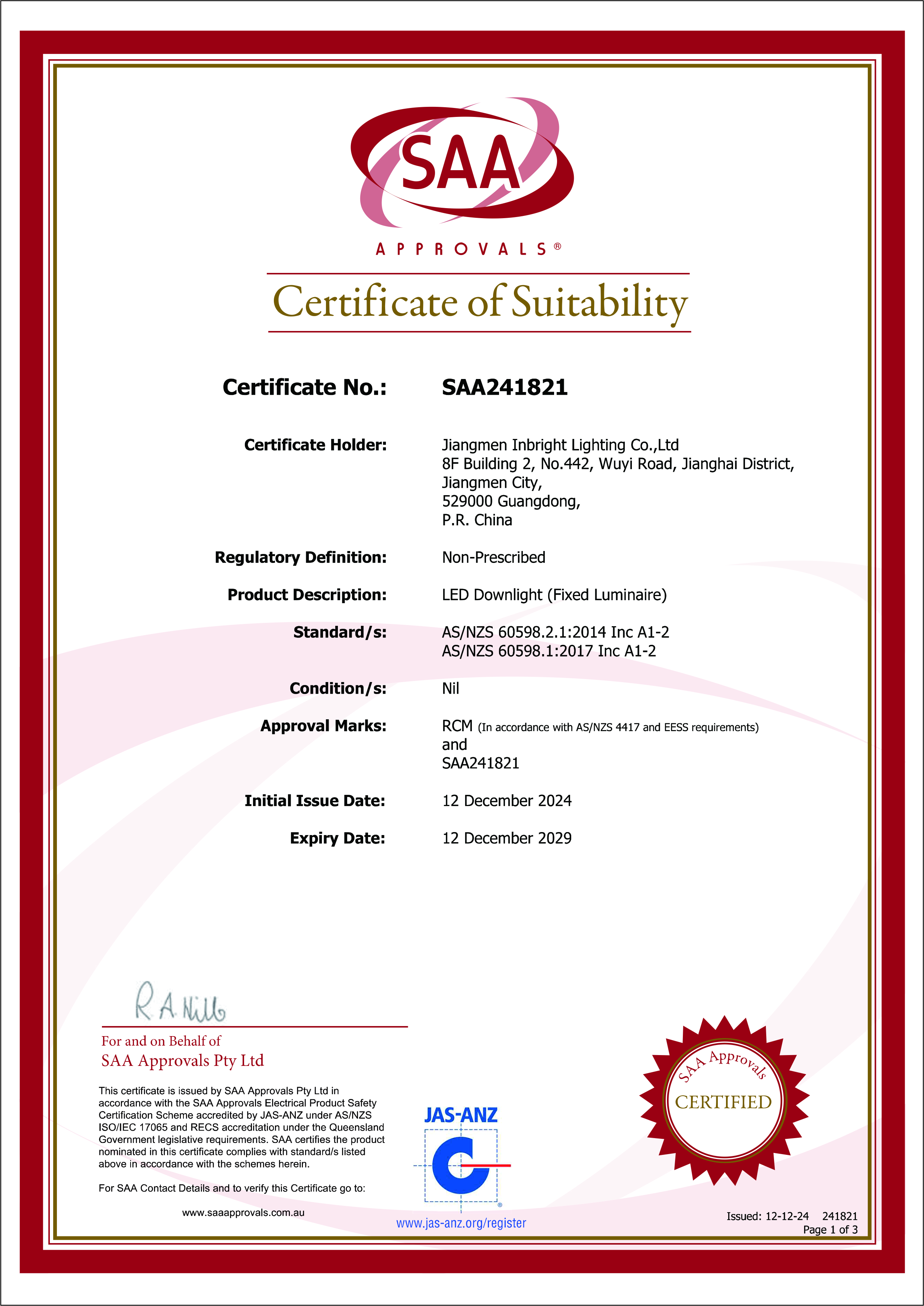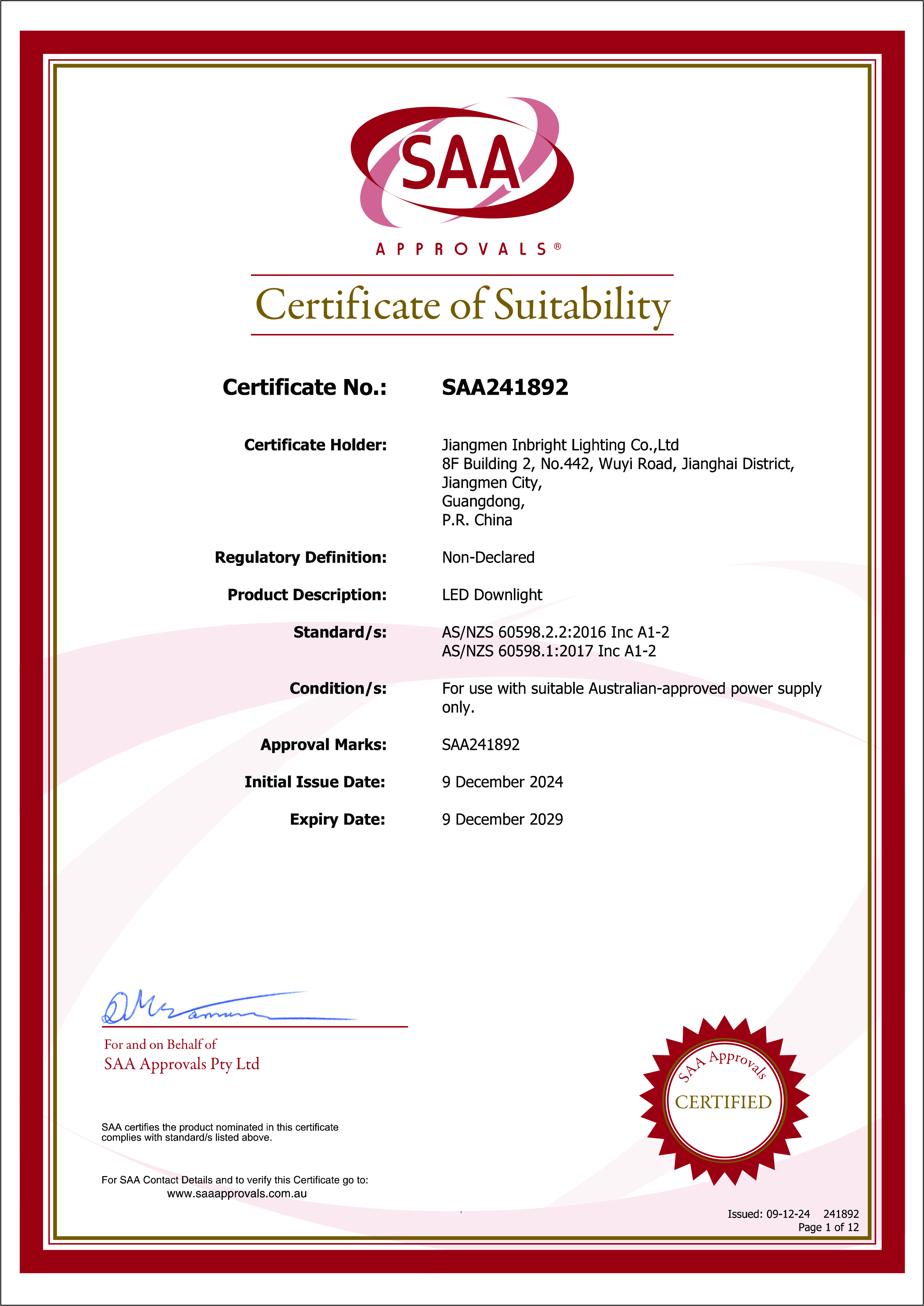 Inbright has passed the ISO 9001 Quality Management System Certification, and the products are certified by international certifications such as CB, SAAS, CE, ROHS, and SASO. The Company possesses complete testing equipment: IES light distribution curve tester (darkroom), integrating-sphere spectrum tester, constant temperature and constant humidity aging chamber, light transmittance tester, etc., and is also providing customers with professional ODM services. The product sales ratio of the Company: 90% for export and 10% for domestic sales. Inbright is committed to providing the most valuable lighting solutions for customers and becoming the most trusted provider of engineering lighting solutions.