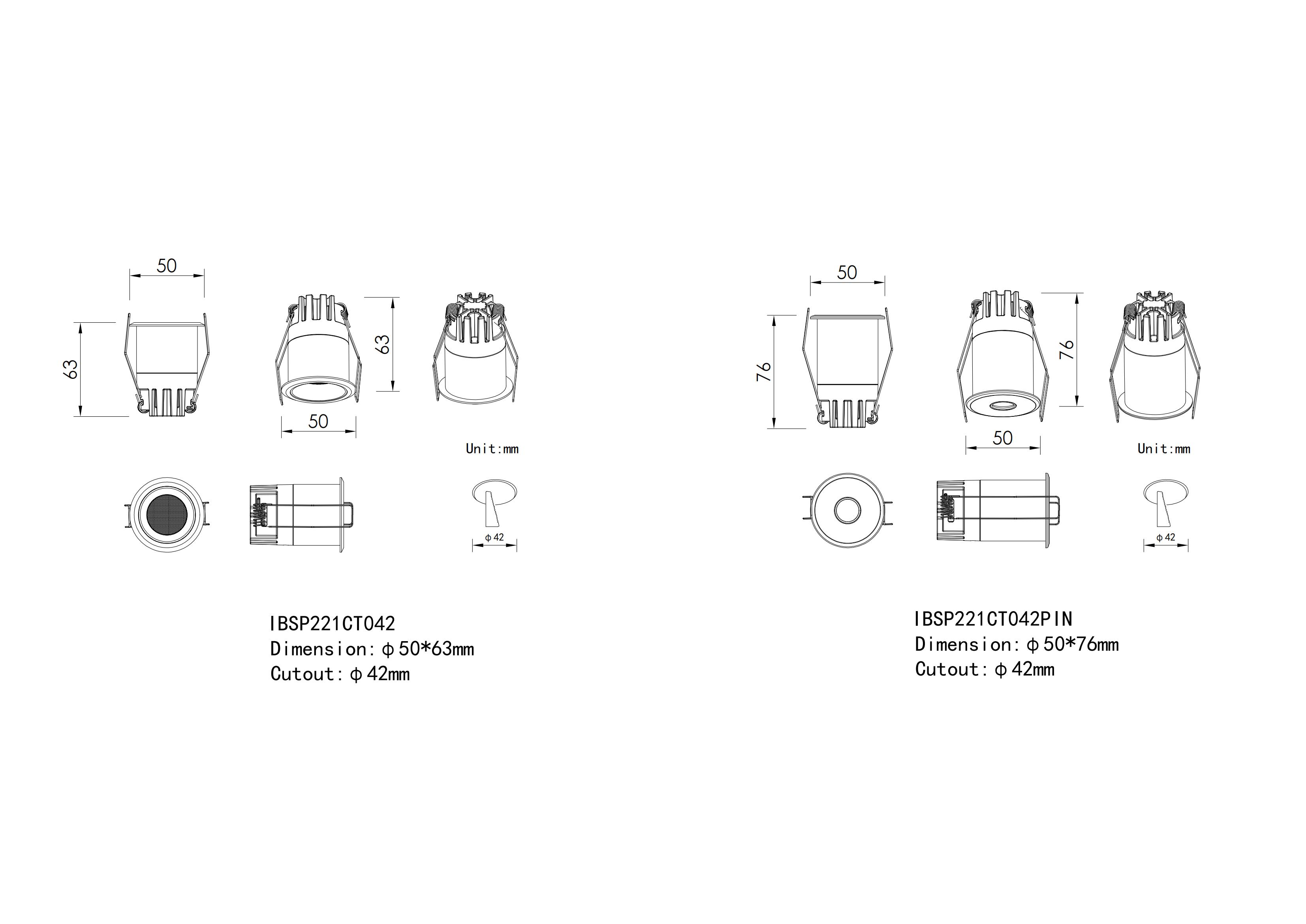 | IBSP221CT042.(C) | 3-7W | Ø50×H76mm | Ø42mm | 70-90 | 15°|24°|38°|50° |