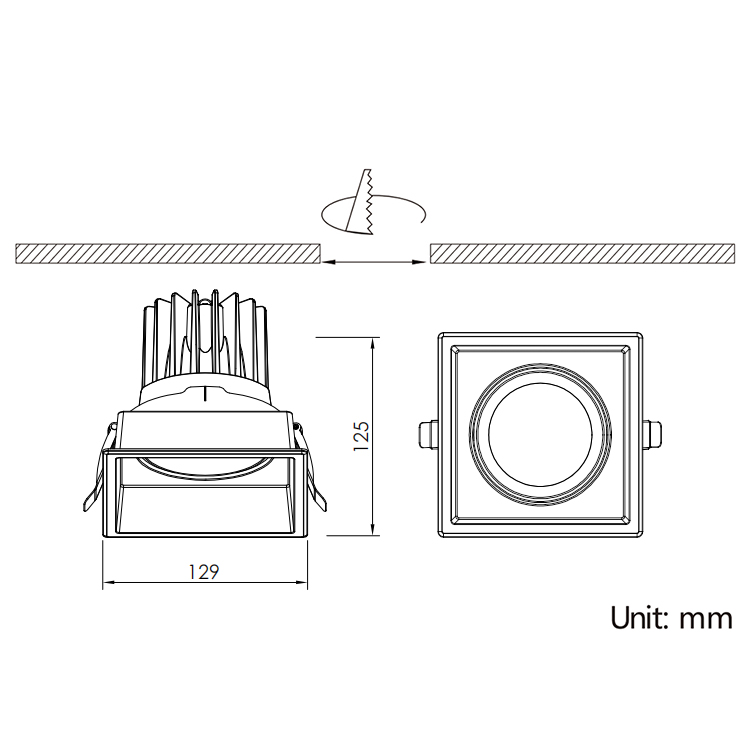 28W,Cutout L120×W120mm,Beam15°/20°/24°/36°/38°/40°/45°/60°,Horizontal 355° + Vertical 30°,IP65,Honeycomb louver Optional,Square Adjustable LED Downlight