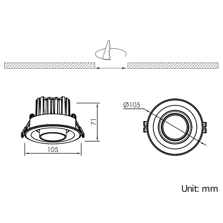 10W,Cutout 95mm,Beam15°/24°/38°/45°/60°,100lm/W,Adjustable 30°,IP65 with Glass Diffuser,Honeycomb louver Optional,Eyeball Recessed LED Downlight